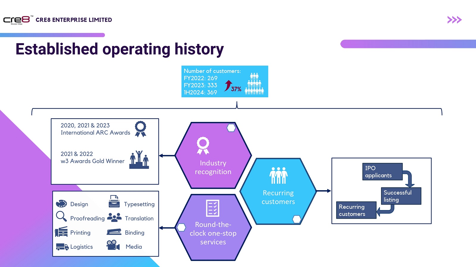CRE8 ENTERPRISE LIMITED Established operating history Round - the - clock one - stop services Recurring customers Industry recognition IPO applicants Recurring customers Successful listing Number of customers: FY2022: 269 FY2023: 333 37% 1H2024: 369