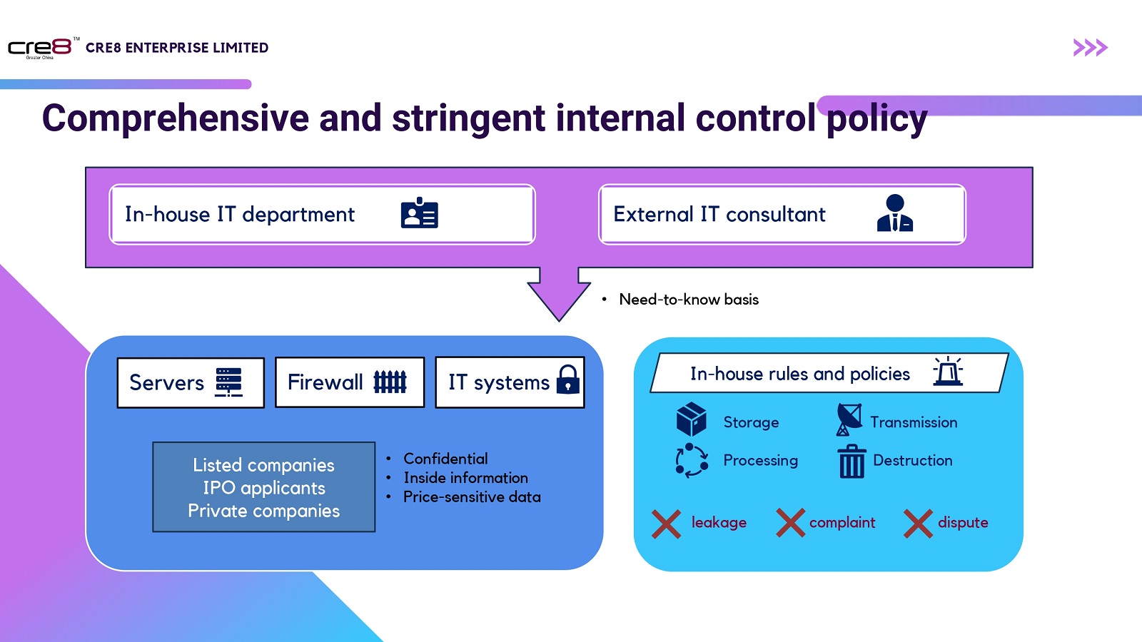 Comprehensive and stringent internal control policy CRE8 ENTERPRISE LIMITED External IT consultant In - house IT department Listed companies IPO applicants Private companies • Confidential • Inside information • Price - sensitive data Servers Firewall IT systems • Need - to - know basis In - house rules and policies Storage Transmission Processing Destruction leakage complaint dispute