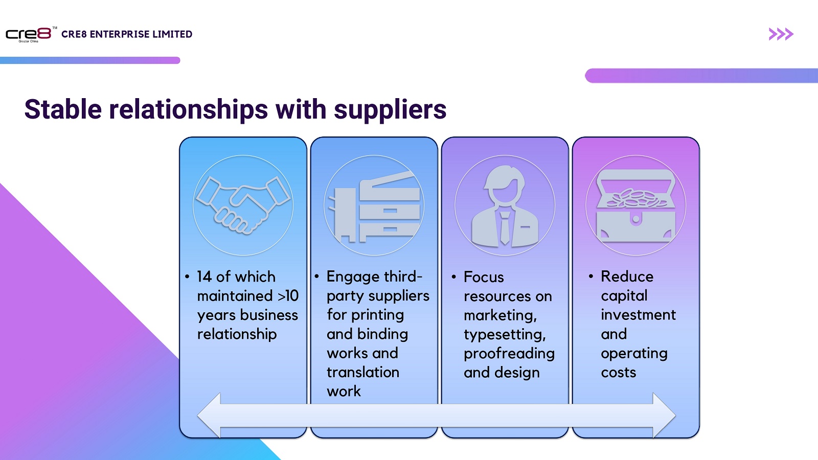 Stable relationships with suppliers CRE8 ENTERPRISE LIMITED • Reduce capital investment and operating costs • Focus resources on marketing, typesetting, proofreading and design • Engage third - party suppliers for printing and binding works and translation work • 14 of which maintained >10 years business relationship