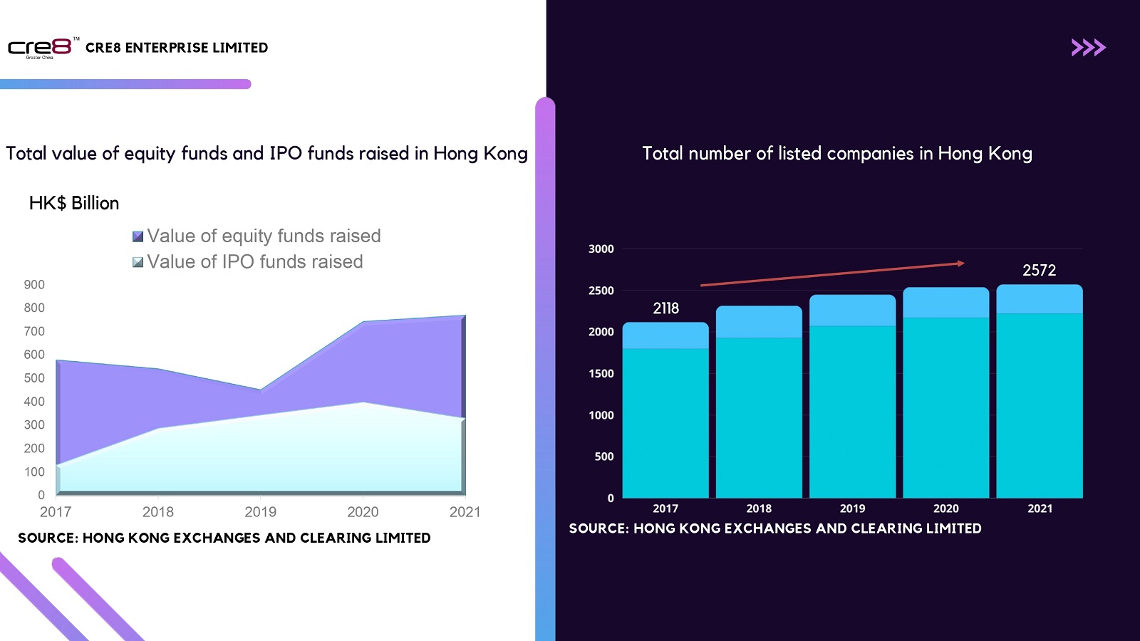 CRE8 ENTERPRISE LIMITED SOURCE: HONG KONG EXCHANGES AND CLEARING LIMITED Total number of listed companies in Hong Kong Total value of equity funds and IPO funds raised in Hong Kong 900 800 700 600 500 400 300 200 100 0 2021 HK$ Billion Value of equity funds raised Value of IPO funds raised 2118 2572 2017 2018 2019 2020 SOURCE: HONG KONG EXCHANGES AND CLEARING LIMITED