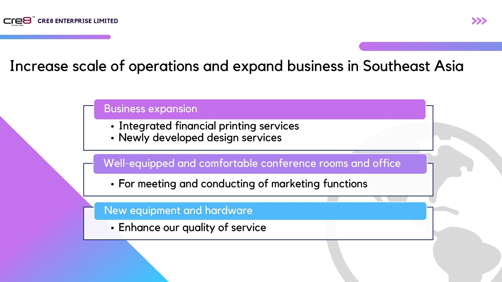 CRE8 ENTERPRISE LIMITED Increase scale of operations and expand business in Southeast Asia Business expansion • Integrated financial printing services • Newly developed design services Well - equipped and comfortable conference rooms and office • For meeting and conducting of marketing functions New equipment and hardware • Enhance our quality of service