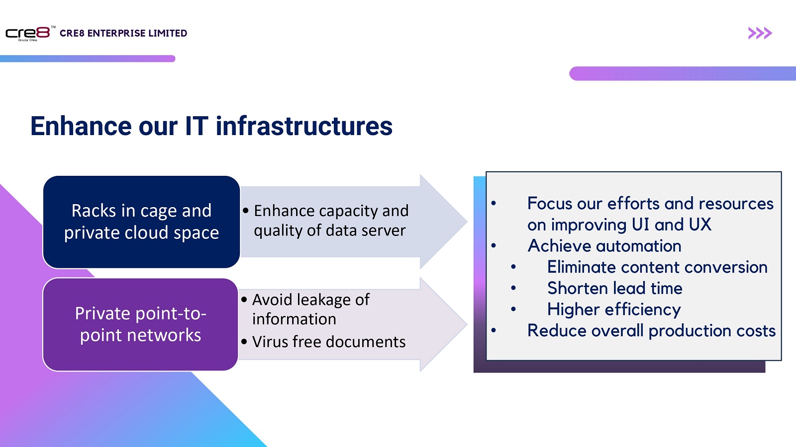 CRE8 ENTERPRISE LIMITED Enhance our IT infrastructures • Enhance capacity and quality of data server Racks in cage and private cloud space • Avoid leakage of information • Virus free documents Private point - to - point networks • Focus our efforts and resources on improving UI and UX • Achieve automation • Eliminate content conversion • Shorten lead time • Higher efficiency • Reduce overall production costs
