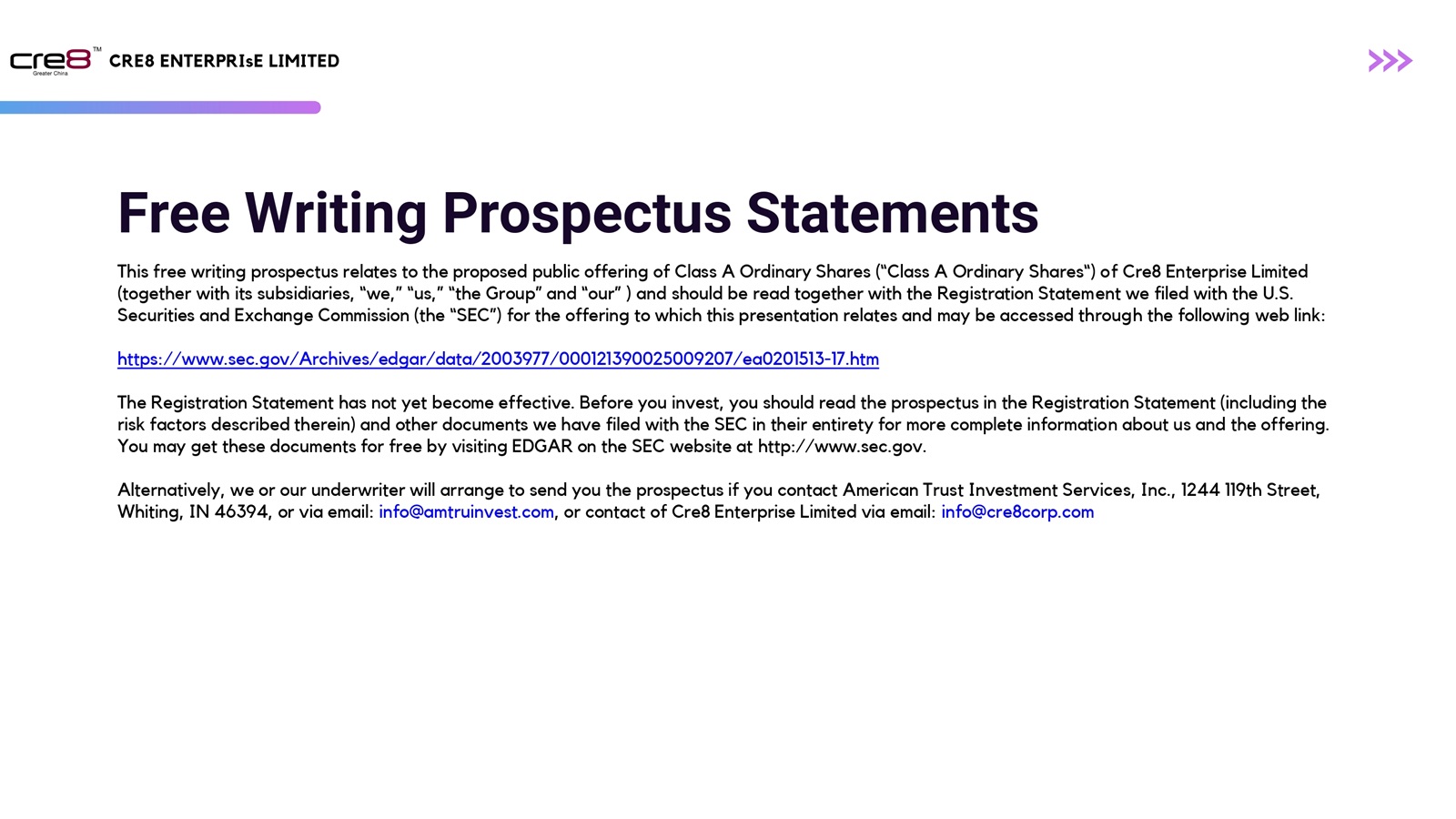 Free Writing Prospectus Statements This free writing prospectus relates to the proposed public offering of Class A Ordinary Shares (“Class A Ordinary Shares“) o f C re8 Enterprise Limited (together with its subsidiaries, “we,” “us,” “the Group” and “our” ) and should be read together with the Registration Statem ent we filed with the U.S. Securities and Exchange Commission (the “SEC”) for the offering to which this presentation relates and may be accessed throug h t he following web link: https://www.sec.gov/Archives/edgar/data/2003977/000121390025009207/ea0201513 - 17.htm The Registration Statement has not yet become effective. Before you invest, you should read the prospectus in the Registratio n S tatement (including the risk factors described therein) and other documents we have filed with the SEC in their entirety for more complete informatio n a bout us and the offering. You may get these documents for free by visiting EDGAR on the SEC website at http://www.sec.gov. Alternatively, we or our underwriter will arrange to send you the prospectus if you contact American Trust Investment Service s, Inc., 1244 119th Street, Whiting, IN 46394 , or via email: info@amtruinvest.com , or contact of Cre8 Enterprise Limited via email: info@cre8corp.com CRE8 ENTERPRIsE LIMITED