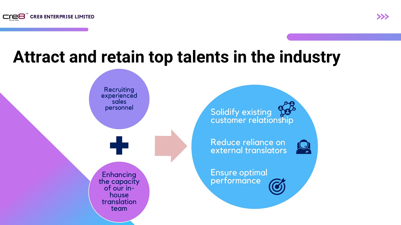 CRE8 ENTERPRISE LIMITED Attract and retain top talents in the industry Recruiting experienced sales personnel Enhancing the capacity of our in - house translation team Solidify existing customer relationship Reduce reliance on external translators Ensure optimal performance