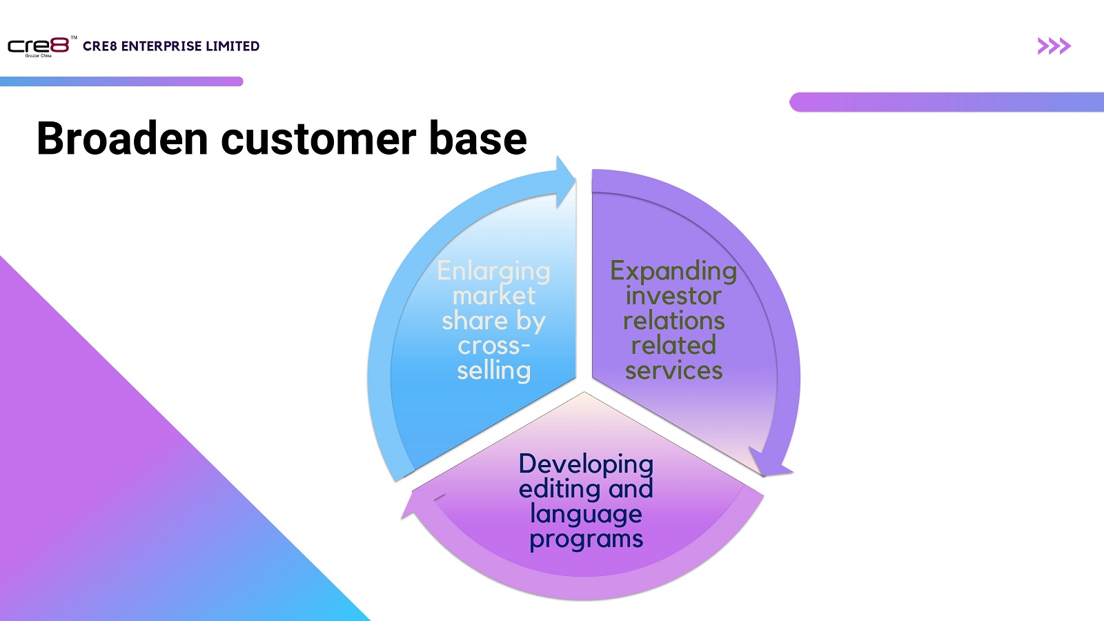 CRE8 ENTERPRISE LIMITED Broaden customer base Expanding investor relations related services Developing editing and language programs Enlarging market share by cross - selling