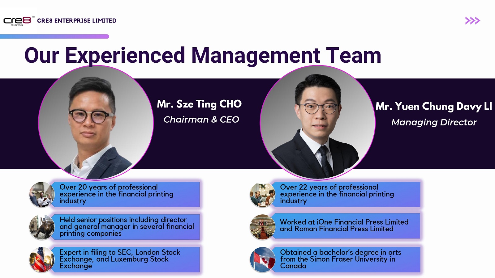 CRE8 ENTERPRISE LIMITED Our Experienced Management Team Mr. Sze Ting CHO Chairman & CEO Mr. Yuen Chung Davy LI Managing Director Over 20 years of professional experience in the financial printing industry Held senior positions including director and general manager in several financial printing companies Expert in filing to SEC, London Stock Exchange, and Luxemburg Stock Exchange Over 22 years of professional experience in the financial printing industry Worked at iOne Financial Press Limited and Roman Financial Press Limited Obtained a bachelor’s degree in arts from the Simon Fraser University in Canada