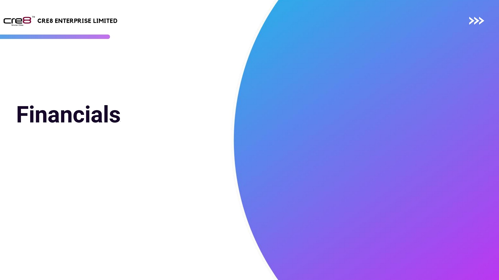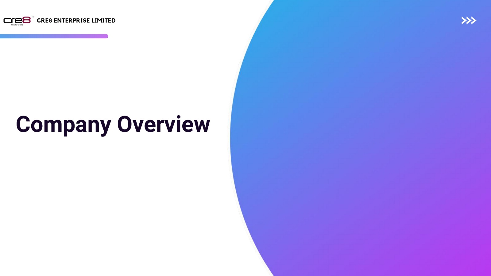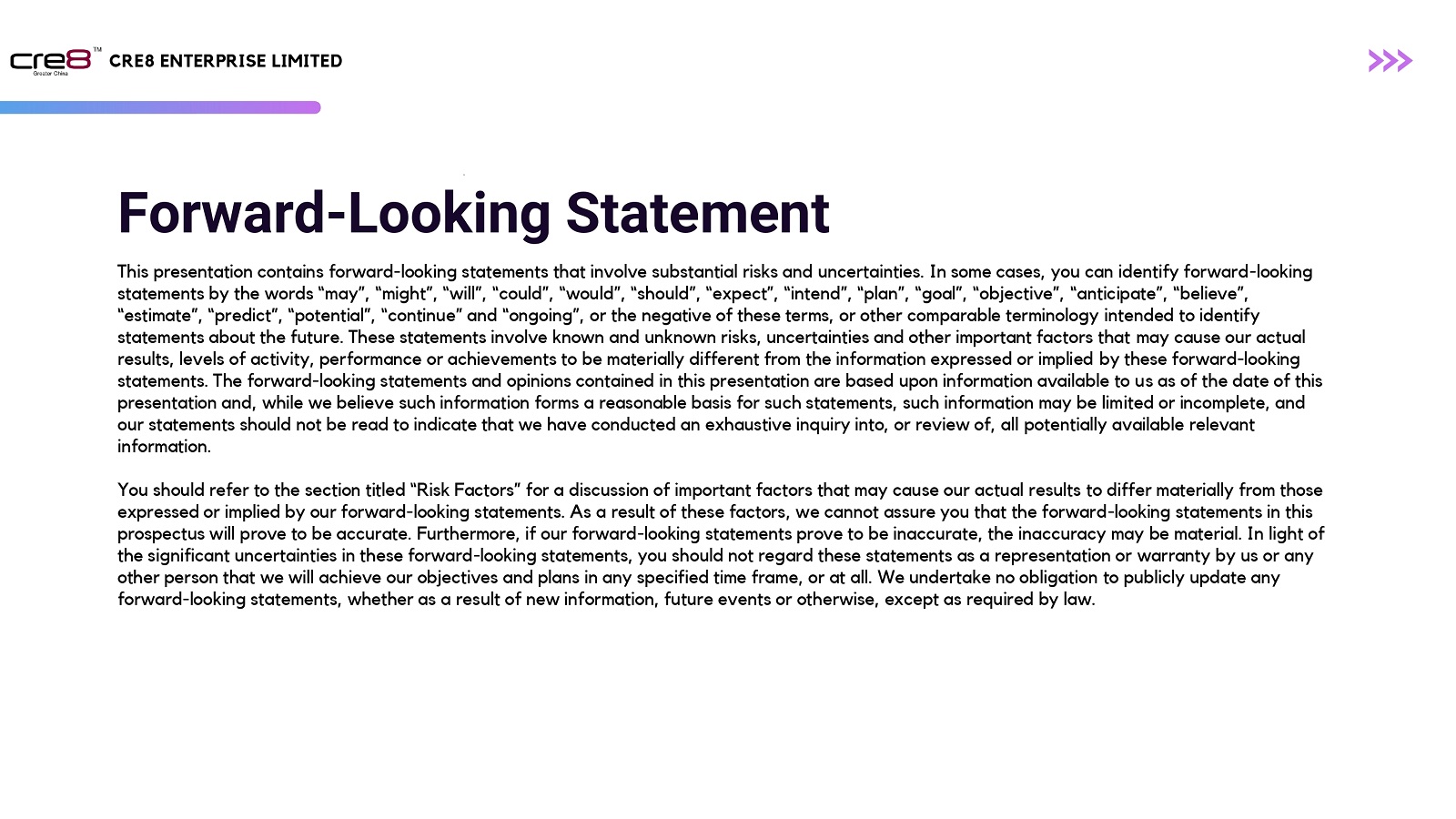 Forward - Looking Statement This presentation contains forward - looking statements that involve substantial risks and uncertainties. In some cases, you can identify forward - looking statements by the words “may”, “might”, “will”, “could”, “would”, “should”, “expect”, “intend”, “plan”, “goal”, “objective”, “anticipate”, “believe”, “estimate”, “predict”, “potential”, “continue” and “ongoing”, or the negative of these terms, or other comparable terminology intended to identify statements about the future. These statements involve known and unknown risks, uncertainties and other important factors that may cause our actual results, levels of activity, performance or achievements to be materially different from the information expressed or implied by these forward - looking statements. The forward - looking statements and opinions contained in this presentation are based upon information available to us as of the date of this presentation and, while we believe such information forms a reasonable basis for such statements, such information may be limited or incomplete, and our statements should not be read to indicate that we have conducted an exhaustive inquiry into, or review of, all potentially available relevant information. You should refer to the section titled “Risk Factors” for a discussion of important factors that may cause our actual results to differ materially from those expressed or implied by our forward - looking statements. As a result of these factors, we cannot assure you that the forward - looking statements in this prospectus will prove to be accurate. Furthermore, if our forward - looking statements prove to be inaccurate, the inaccuracy may be material. In light of the significant uncertainties in these forward - looking statements, you should not regard these statements as a representation or warranty by us or any other person that we will achieve our objectives and plans in any specified time frame, or at all. We undertake no obligation to publicly update any forward - looking statements, whether as a result of new information, future events or otherwise, except as required by law. CRE8 ENTERPRISE LIMITED