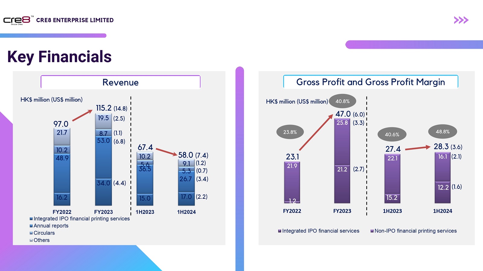 Key Financials CRE8 ENTERPRISE LIMITED 16.2 15.0 36.5 10.2 48.9 8.7 53.0 5.6 1H2023 1H2024 FY2022 FY2023 Integrated IPO financial printing services Annual reports Circulars Others 97.0 21.7 115.2 (14.8) HK$ million (US$ million) 21.2 FY2023 1H2023 1H2024 Integrated IPO financial services Non - IPO financial printing services Gross Profit and Gross Profit Margin 23.1 21.9 Revenue 67.4 10.2 23.8% HK$ million (US$ million) 27.4 22.1 58.0 (7.4) 9.1 (1.2) 5.3 (0.7) 26.7 (3.4) 17.0 (2.2) 19.5 (2.5) 28.3 (3.6) 40.6% 48.8% 16.1 (2.1) (1.1) (6.8) 34.0 (4.4) 12.2 (1.6) 15.2 40.8% 47.0 (6.0) 25.8 (3.3) (2.7) 1.2 FY2022