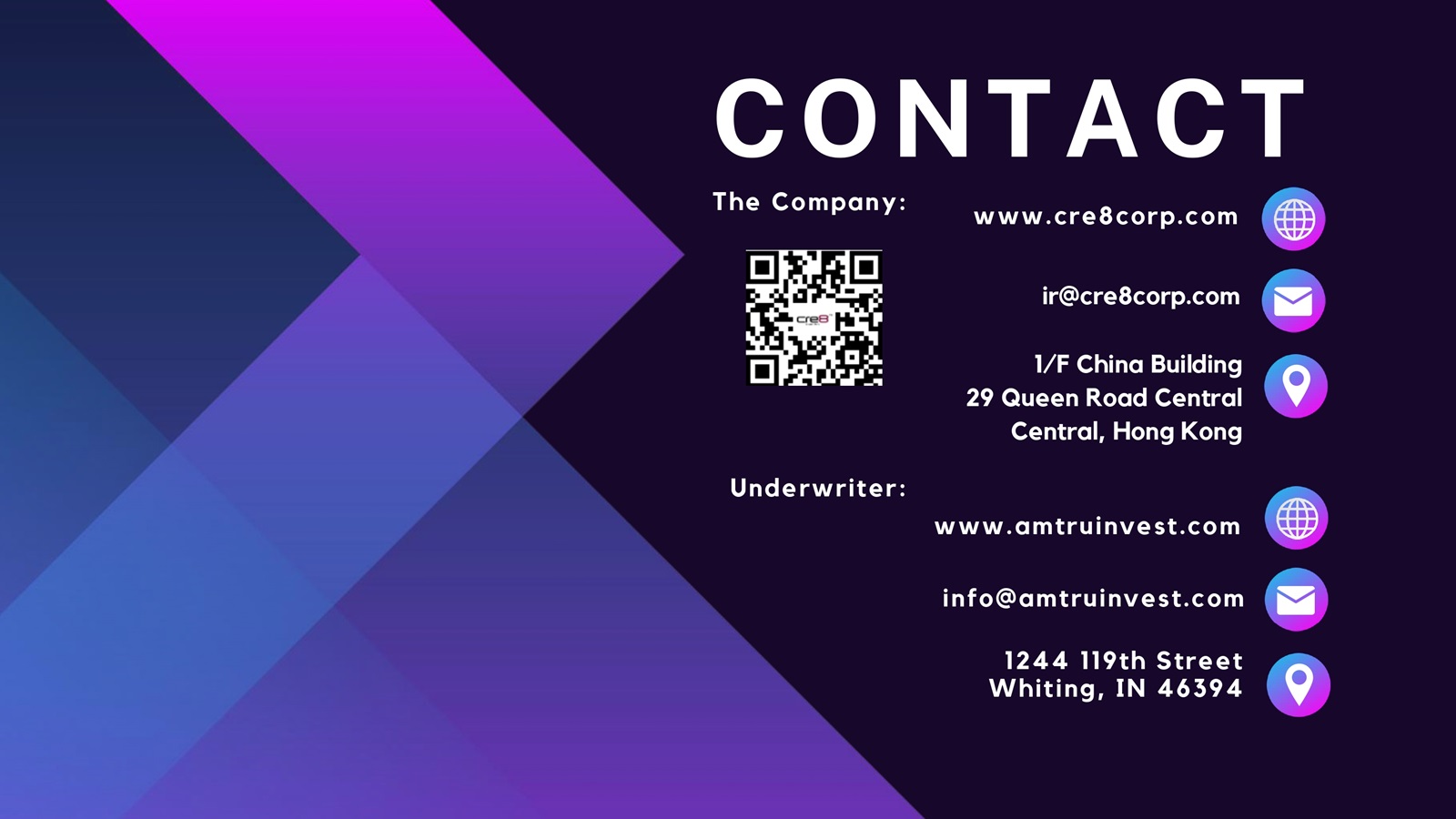 CONTACT www.cre8corp.com ir@cre8corp.com 1/F China Building 29 Queen Road Central Central, Hong Kong The Company: www.amtruinvest.com 1244 119th Street Whiting, IN 46394 Underwriter: info@amtruinvest.com
