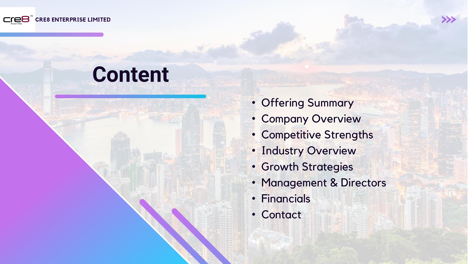 Content • Offering Summary • Company Overview • Competitive Strengths • Industry Overview • Growth Strategies • Management & Directors • Financials • Contact CRE8 ENTERPRISE LIMITED