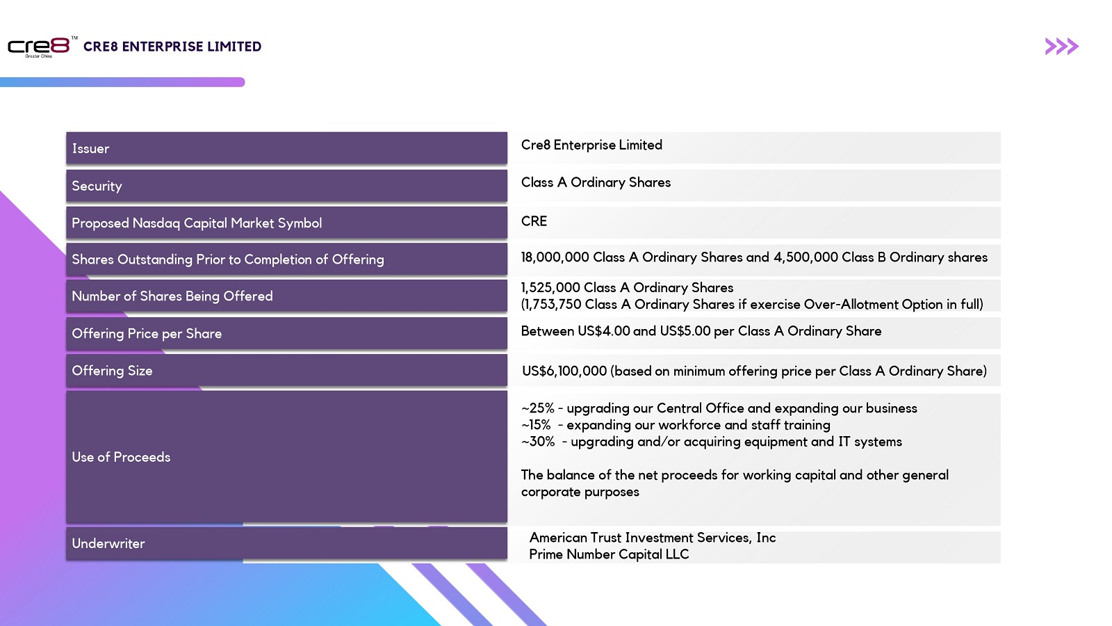 CRE8 ENTERPRISE LIMITED Issuer Cre8 Enterprise Limited Security Class A Ordinary Shares Proposed Nasdaq Capital Market Symbol CRE Shares Outstanding Prior to Completion of Offering 18,000,000 Class A Ordinary Shares and 4,500,000 Class B Ordinary shares Number of Shares Being Offered 1,525,000 Class A Ordinary Shares (1,753,750 Class A Ordinary Shares if exercise Over - Allotment Option in full) Offering Price per Share Between US$4.00 and US$5.00 per Class A Ordinary Share Offering Size US$6,100,000 (based on minimum offering price per Class A Ordinary Share) Use of Proceeds ~25% - upgrading our Central Office and expanding our business ~15% - expanding our workforce and staff training ~30% - upgrading and/or acquiring equipment and IT systems The balance of the net proceeds for working capital and other general corporate purposes Underwriter American Trust Investment Services, Inc Prime Number Capital LLC