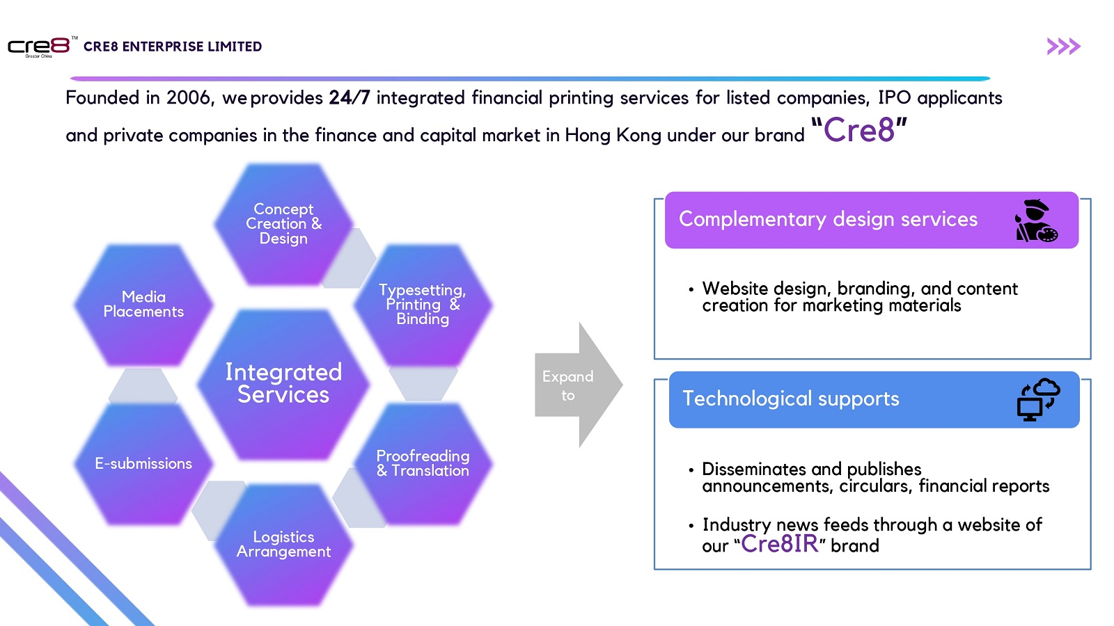 Founded in 2006, we provides 24/7 integrated financial printing services for listed companies, IPO applicants and private companies in the finance and capital market in Hong Kong under our brand “ Cre8 ” CRE8 ENTERPRISE LIMITED Integrated Services Concept Creation & Design Typesetting, Printing & Binding Proofreading & Translation Logistics Arrangement E - submissions Media Placements Expand to Complementary design services • Website design, branding, and content creation for marketing materials Technological supports • Disseminates and publishes announcements, circulars, financial reports • Industry news feeds through a website of our “ Cre8IR ” brand