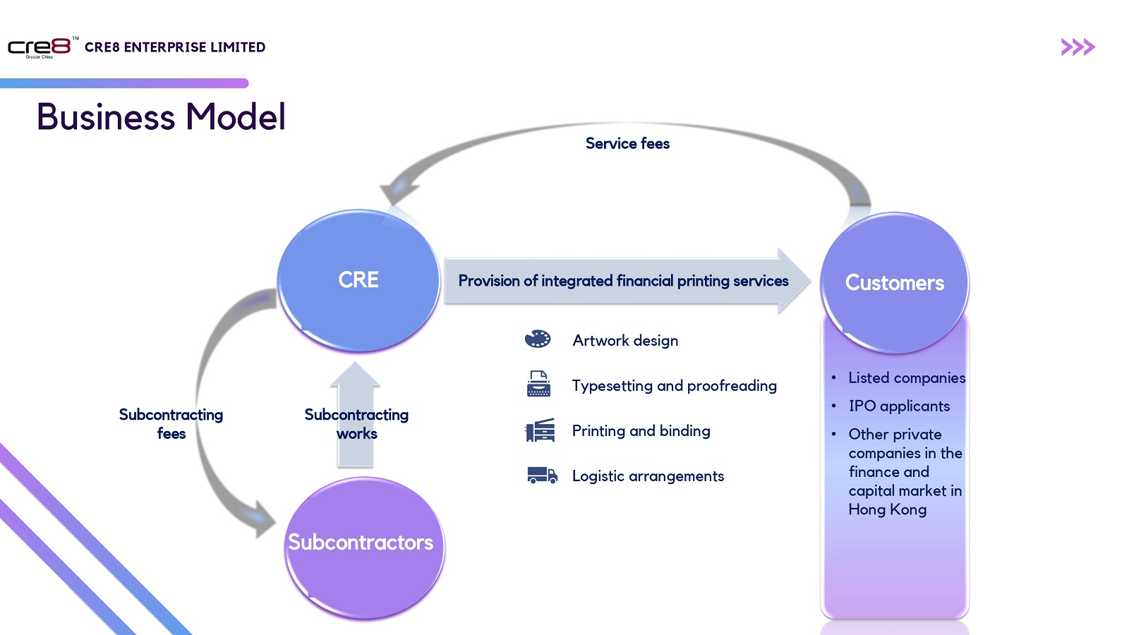 Business Model CRE Artwork design Typesetting and proofreading Printing and binding Logistic arrangements Provision of integrated financial printing services Customers • Listed companies • IPO applicants • Other private companies in the finance and capital market in Hong Kong Subcontracting fees Subcontractors Subcontracting works Service fees CRE8 ENTERPRISE LIMITED