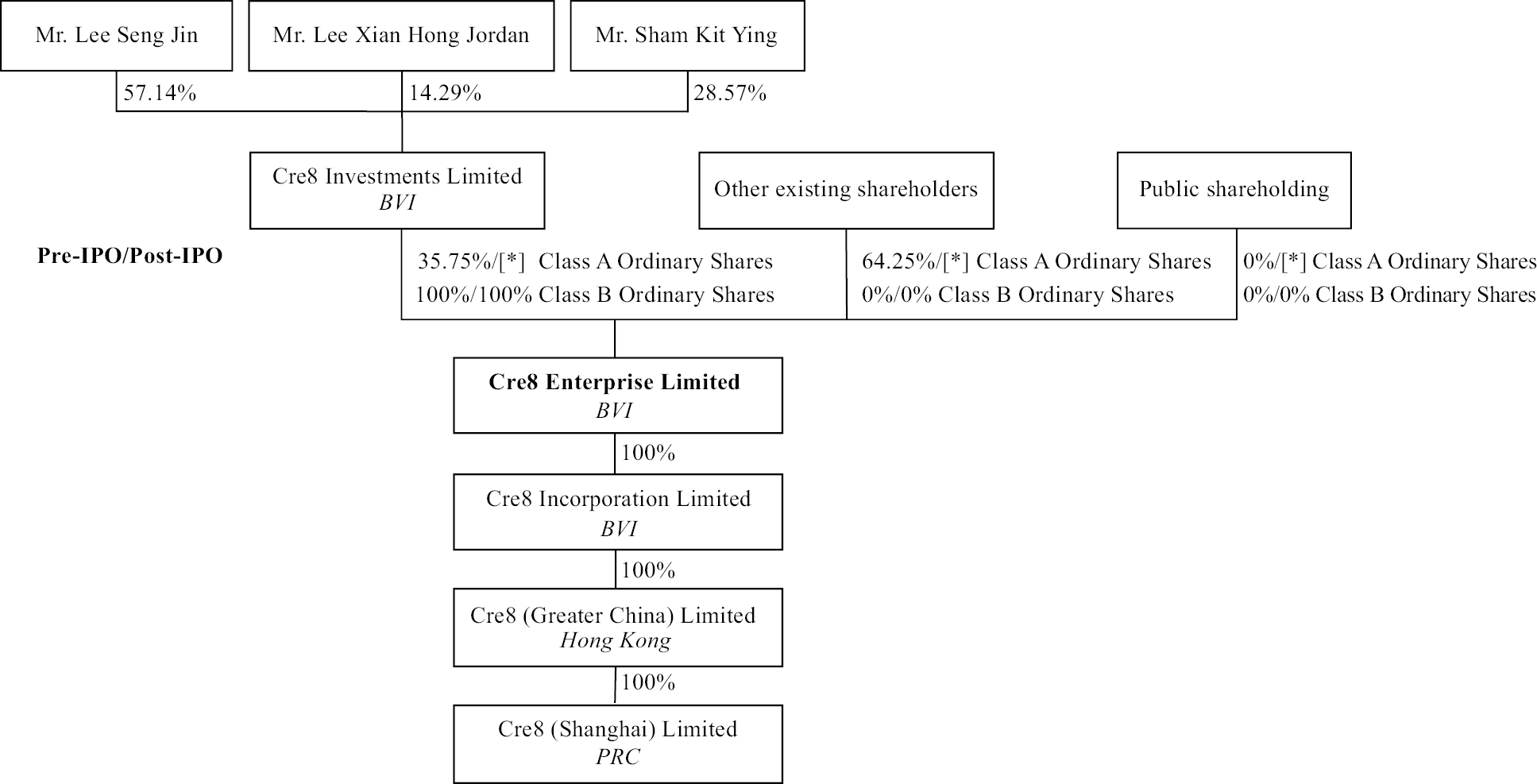 This is an initial public offering (the “Offering”) of [*] Class A ordinary shares of no par value (the “Class A Ordinary Shares”), of Cre8 Enterprise Limited (“Cre8 BVI”, the “Company”, “we”, “our”, “us”). The [*] Class A Ordinary Shares that we are offering, represents [*]% of the Class A Ordinary Shares following completion of the Offering. Following the Offering, [*]% of the Class A Ordinary Shares will be held by public shareholders, assuming the underwriters do not exercise the over-allotment option.