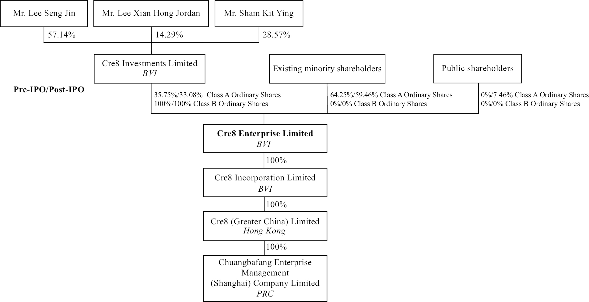 Cre8 BVI’s issued share capital is a dual-class structure consisting of Class A Ordinary Shares and Class B Ordinary Shares. Class A Ordinary Shares are the only class of Ordinary Shares being offered in this Offering. Holders of Class A Ordinary Shares and Class B Ordinary Shares shall vote together as one class on all resolutions of the shareholders and have the same rights except each Class A Ordinary Share shall entitle its holder to one (1) vote and each Class B Ordinary Share shall entitle its holder to twenty (20) votes. Each Class B Ordinary Share is convertible into one (1) Class A Ordinary Share at any time at the option of the holder thereof but Class A Ordinary Shares are not convertible into Class B Ordinary Shares.